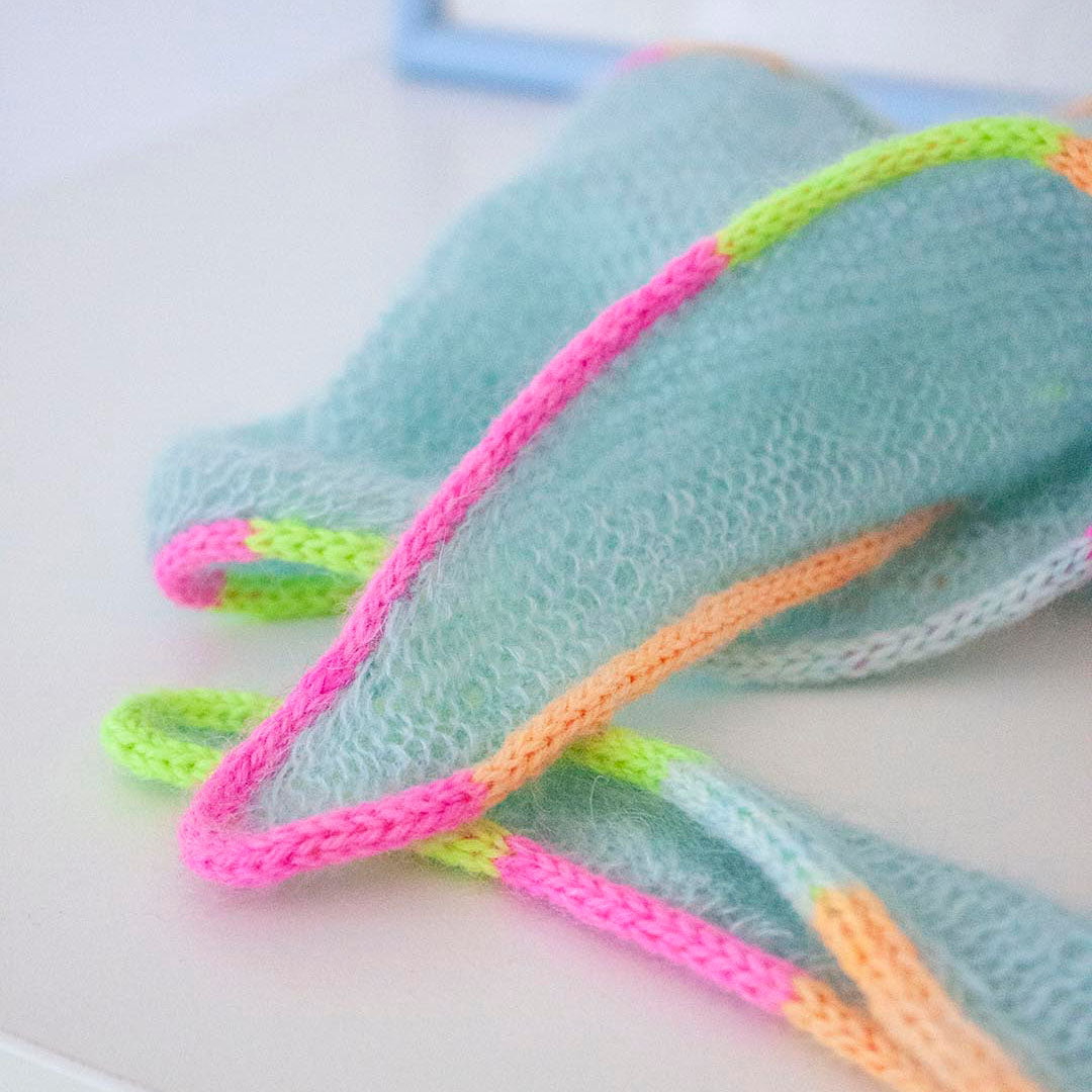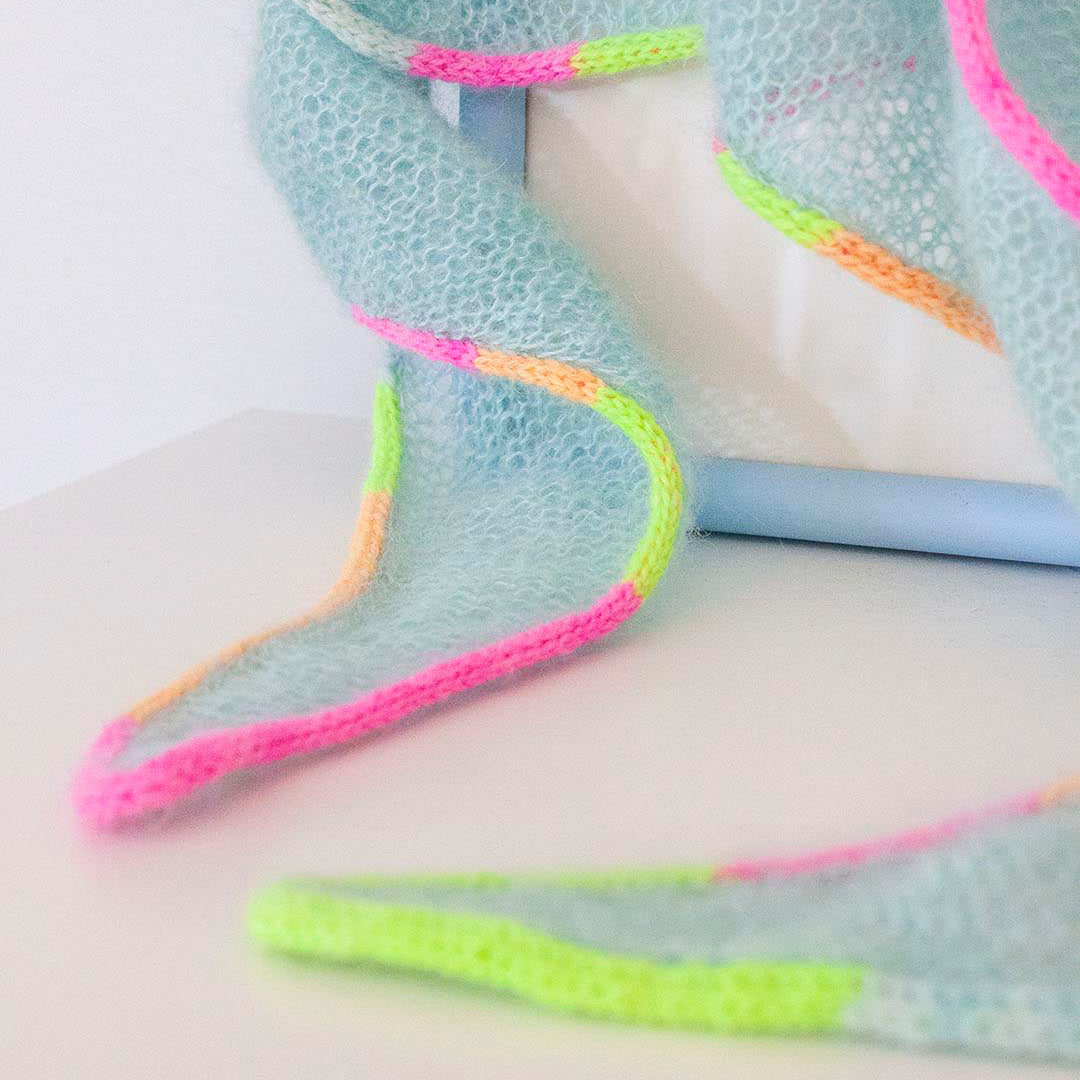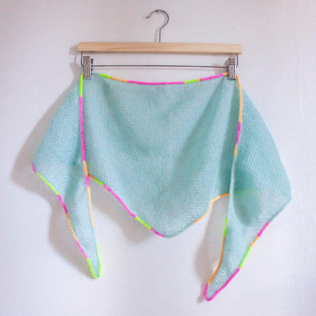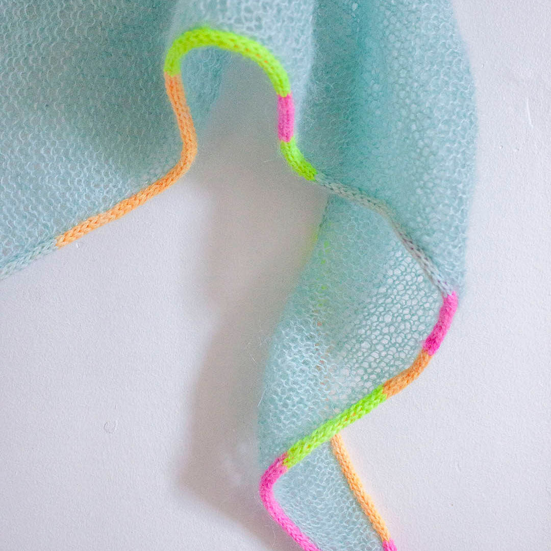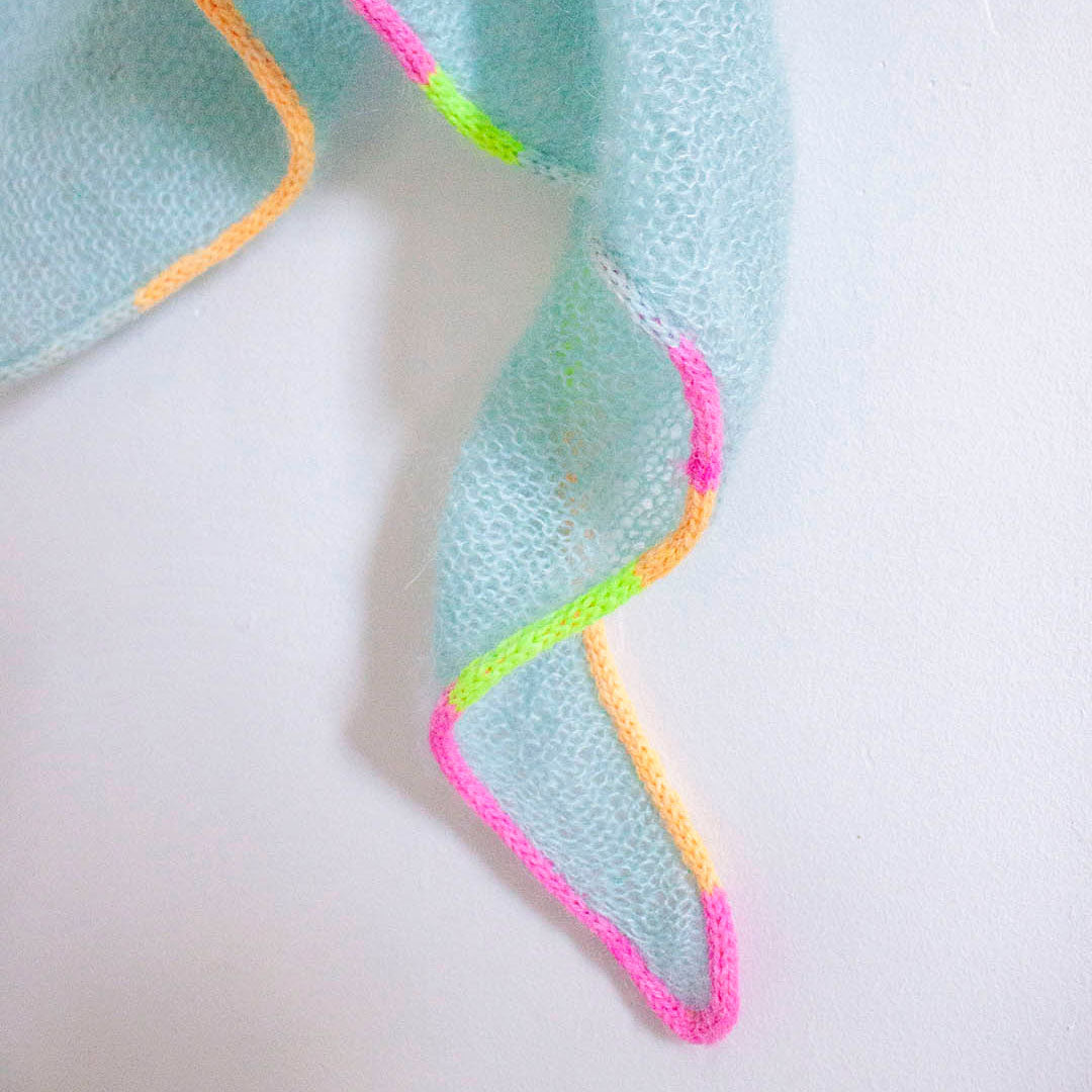 The scarf is knitted flat with garter stitch and the triangular shape is formed with increases and decreases. The edges are strengthened with colourful i-cord.