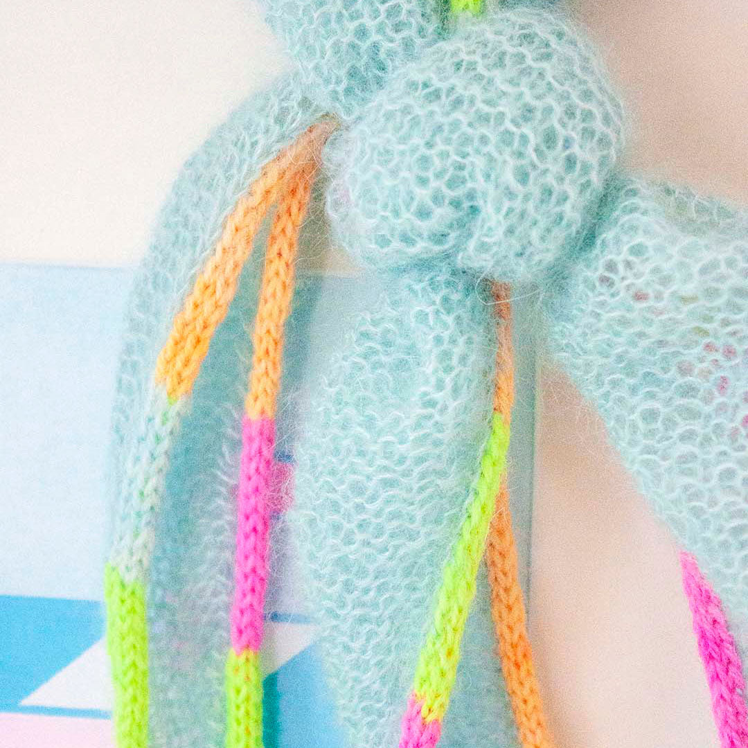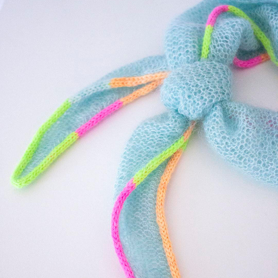Bridget scarf is a simple lightweight triangle scarf with colourful i-cord edge to add twist to the design. You can use a multifunctional Bridget scarf around your neck, covering shoulders from the sun or wrap it around your head.