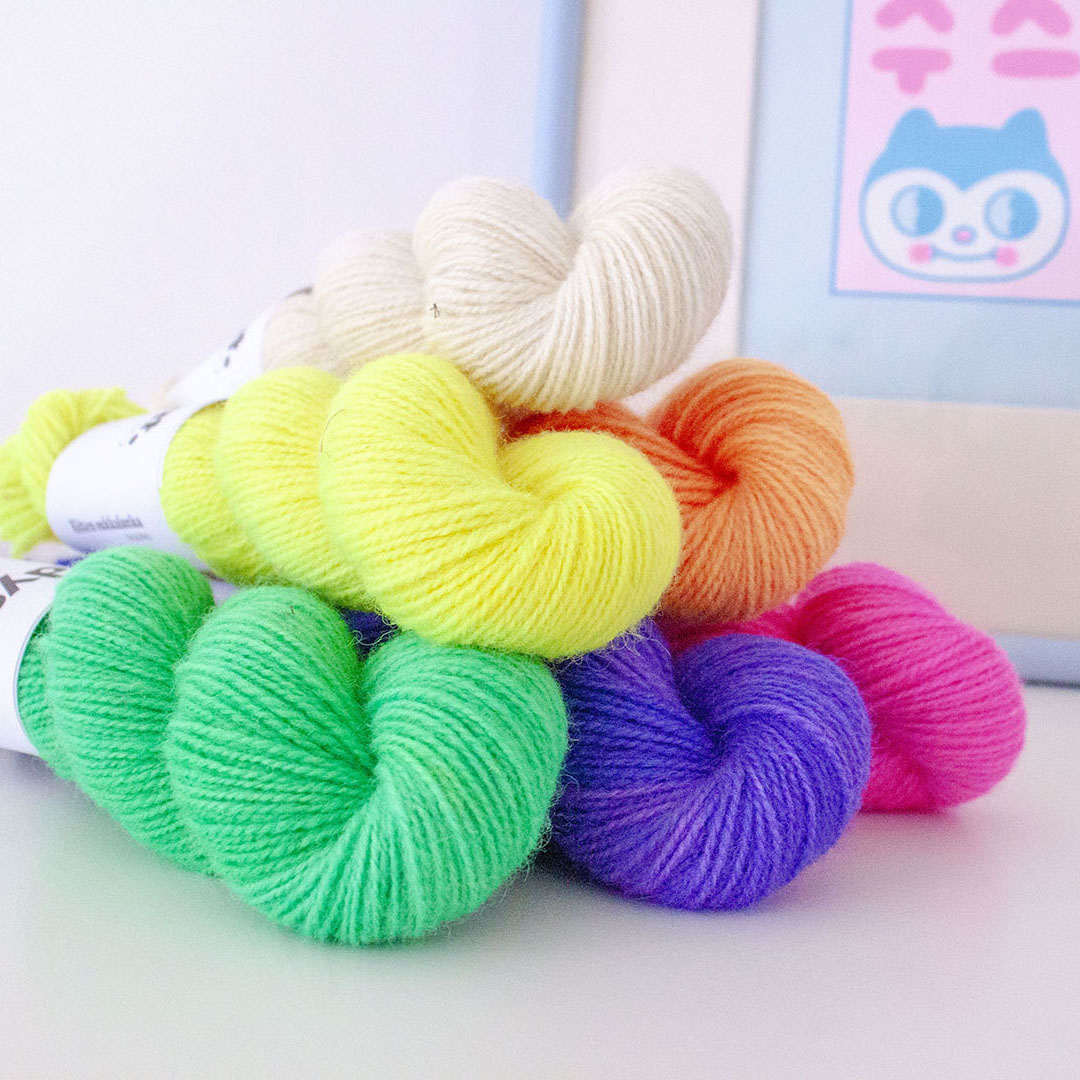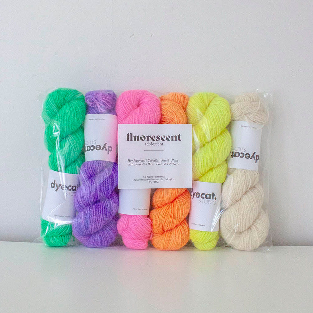 Fluorescent Adolescent - lankalankku on kirkkaasti loistava lankasetti neon sävyjä, täykyt just niihin kasarisukkiin! Lankun langoilla neulot takuuvarmasti näyttävät kirjoneuleet. Neon lankku sisältää kuusi 50g vyyhtiä Kitten sukkalankaa sävyissä Da ba dee da ba di, Extraterrestrial Peas, Natu, Rapsi, Työmiäs sekä Hey Pussycat!.