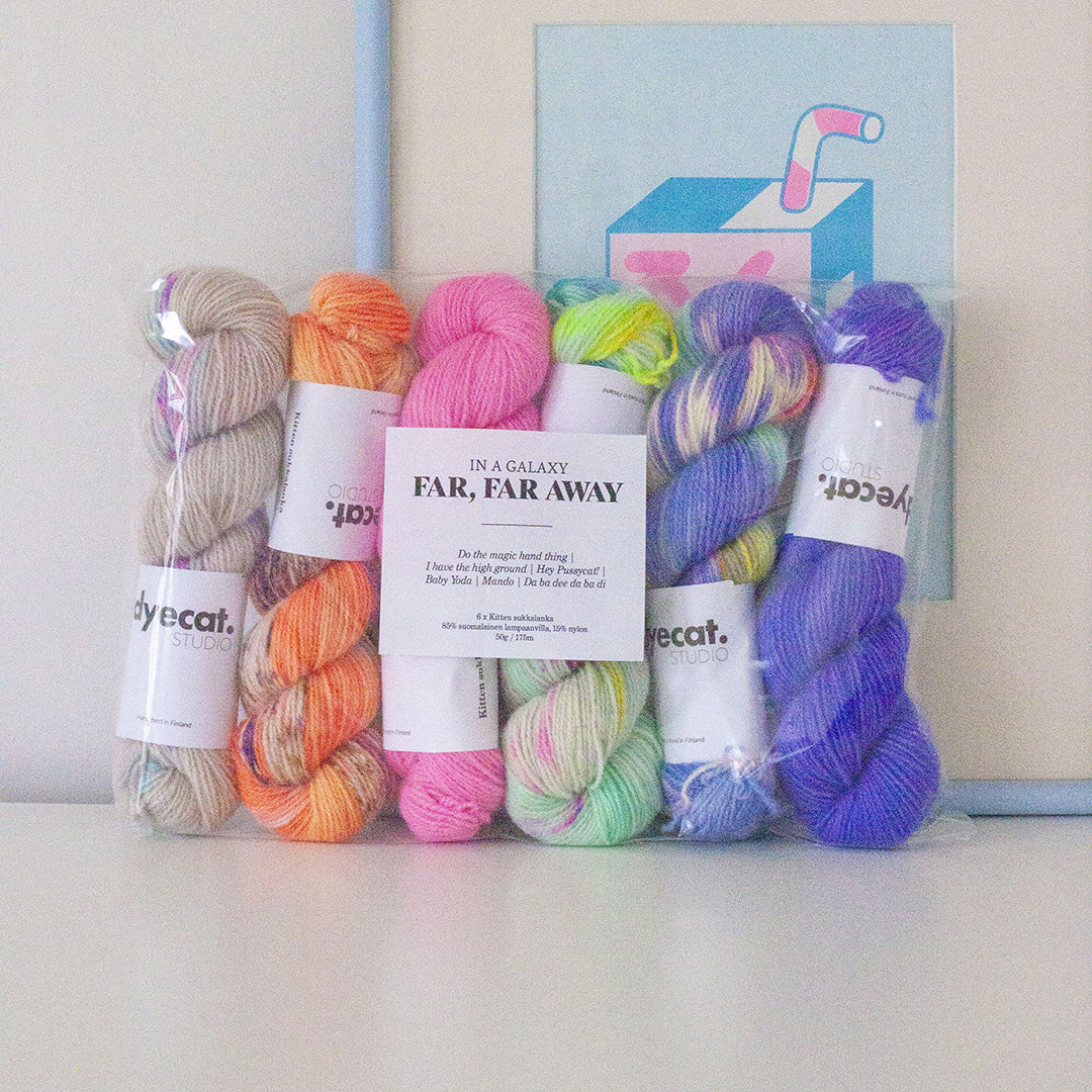 Valmistaudu intergalaktiseen seikkailuun In a galaxy far, far away - lankalankun kanssa! Lankusta löydät neljä Star Warsin inspiroimaa sävyä sekä kaksi korostusväriä, joilla neulot esimerkiksi Online/Offline-sukat. Lankku sisältää yhteensä kuusi vyyhtiä Kitten sukkalankaa (á 50g) sävyissä Do the magic hand thing, I have the high ground, Hey Pussycat!, Baby Yoda, Mando sekä Da ba dee da ba di.