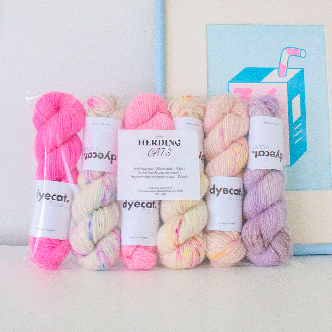 It’s like herding cats - lankalankku sisältää kuusi kissamaista sävyä, joista neulot suloiset sukat, asusteet tai vaikka villapaidan. Lankku sisältää kuusi 50g vyyhtiä Kitten sukkalankaa sävyissä Hey Pussycat!, Kitten train, Miau, Is this how kittens are made?, Sweet dreams are made of cats sekä Tuhmis