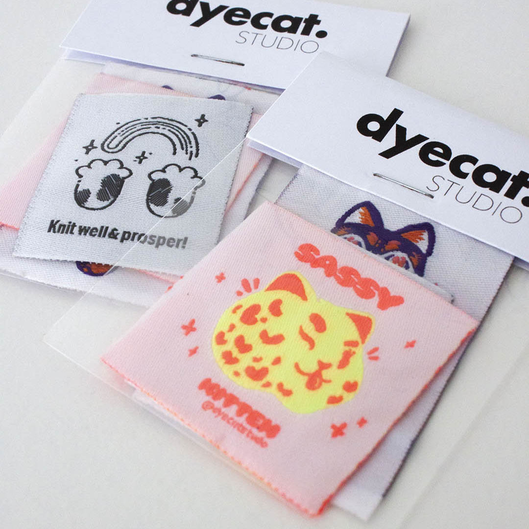 Setti sisältää kolme erilaista kangasmerkkiä (Lucky dyecat, Sassy Kitten sekä Knit well & prosper!)