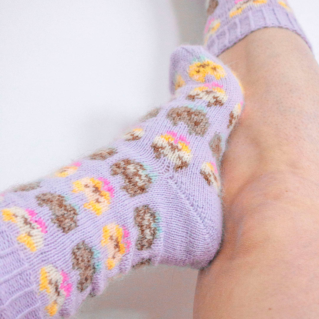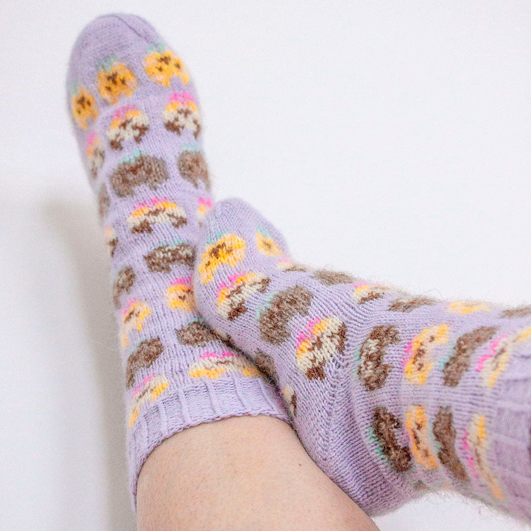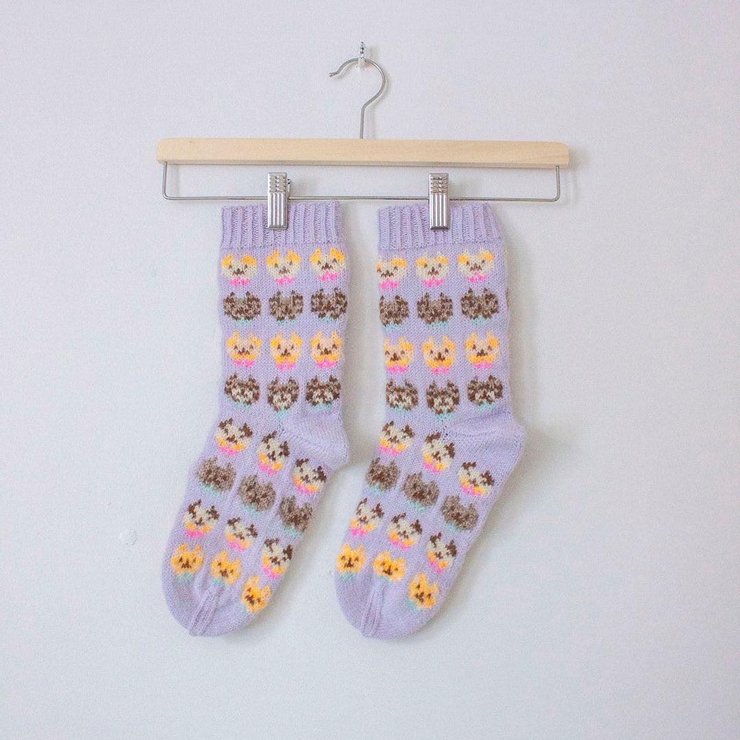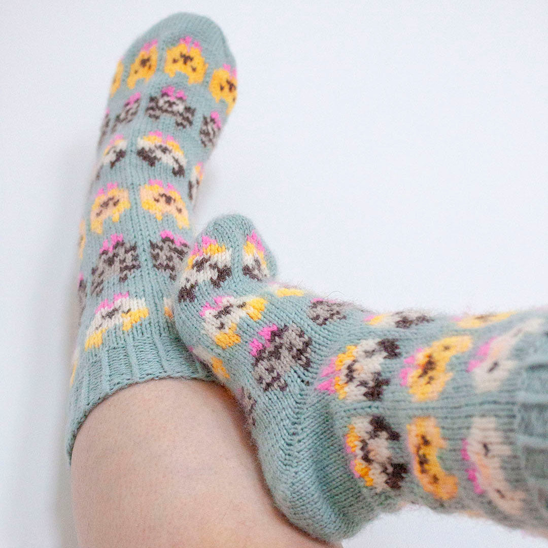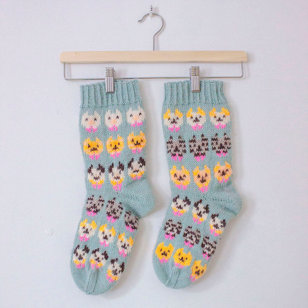 Kitten fête socks are traditional colourwork socks with cute cat inspired patterns.
