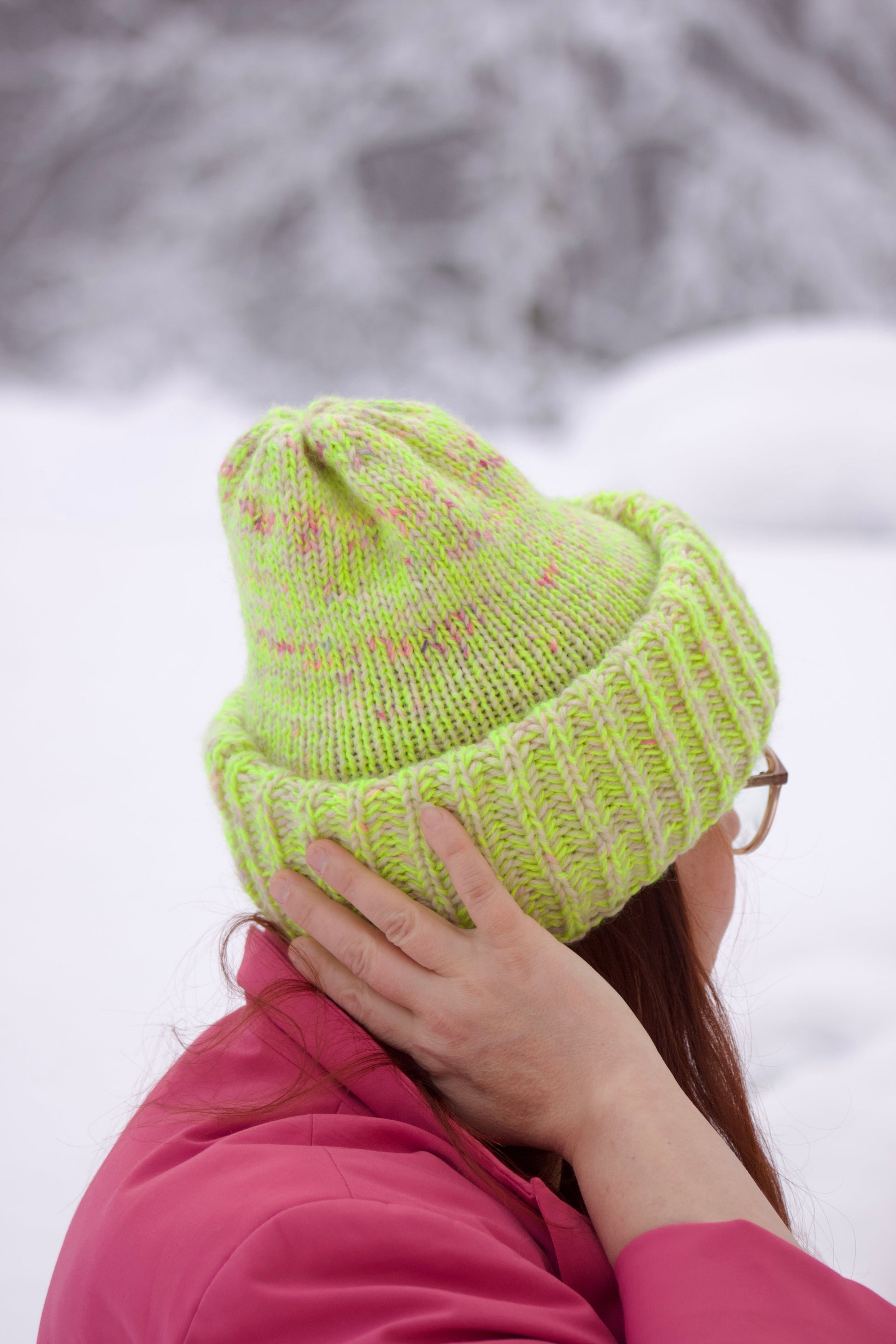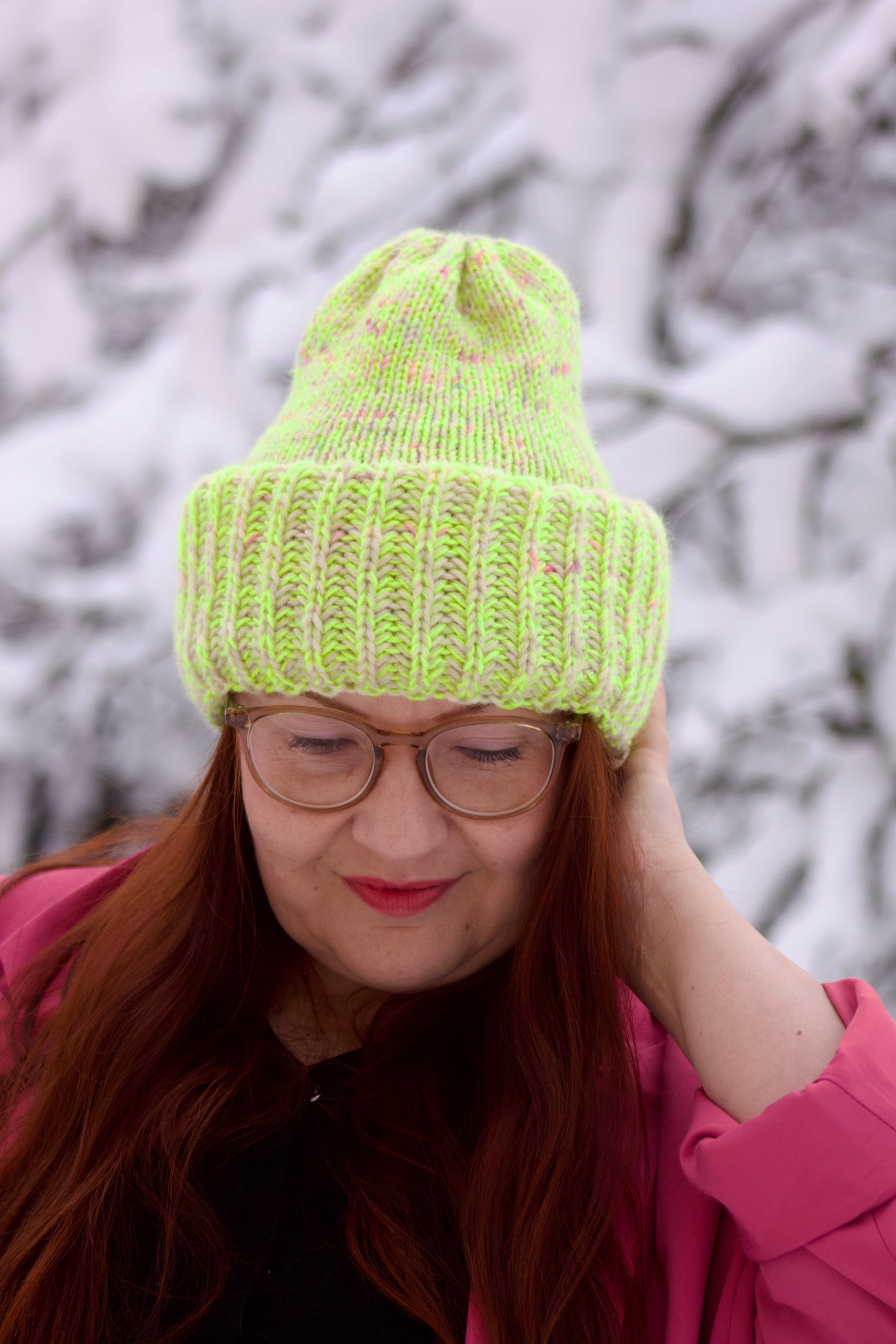 Nonparelli beanie is knitted with two strands of yarn to guarantee extra colourful end results while the bottom hem is worked with brioche stitch to allow extra chunkiness for ears.